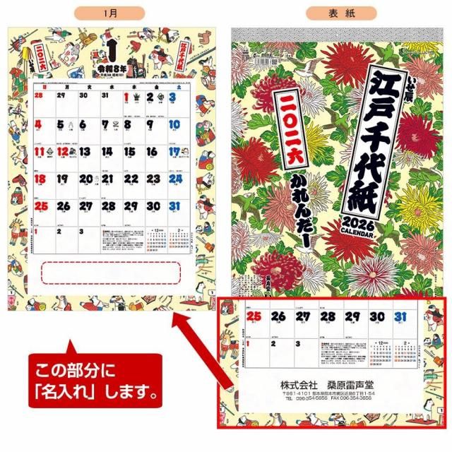 ダントツの人気! 「今年もちょうだい」と言わせる、カレンダー 江戸千代紙(いせ辰)名入れカレンダー 2026年版名入れカレンダー【TD-835】縦幅 535mm × 横幅 380mm ![]() 「名入れ」できる項目は6項目となります。
