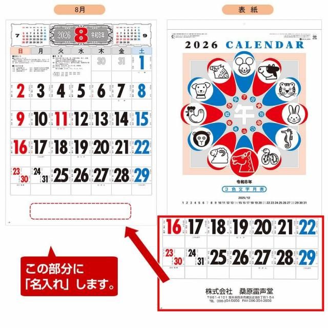 【SG-288】3色文字月表 名入れカレンダー 2026年
