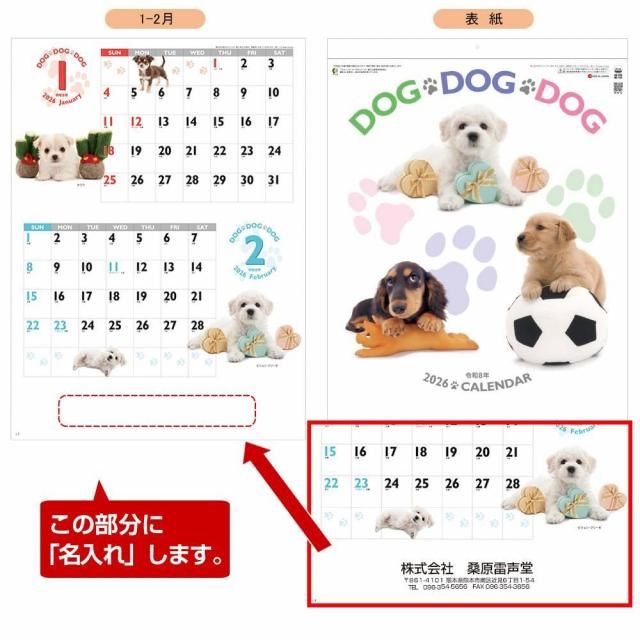 大人気のワンちゃんシリーズ! 心癒やす愛らしい子犬たち、かわいい犬のカレンダー DOG・DOG・DOG名入れカレンダー 2026年版名入れカレンダー【SG-229】縦幅 535mm × 横幅 380mm ![]() 「名入れ」できる項目は6項目となります。