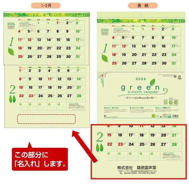 【TD-944】グリーン2ケ月eco(15ヶ月)名入れカレンダー 2026年
