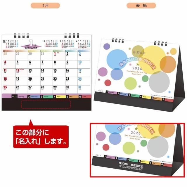 インデックスタイプなので使いやすい!! 六曜も入った卓上カレンダースケジュール管理がしやすい レインボーインデックス卓上カレンダー 2026年版名入れカレンダー【FU-48】縦幅 150mm × 横幅 180mm ![]() 「名入れ」できる項目は6項目となります。